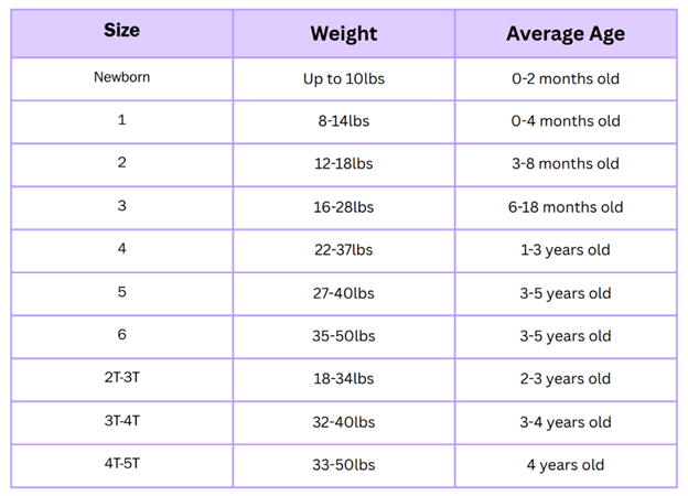 We understand that sometimes it is hard to decide which size of diaper to select for your growing little one. Below is a chart to help you choose. It is important not to select a size that is too large as it can lead to leakage, increase diaper rash, increased infection potential, and overall discomfort for your child.